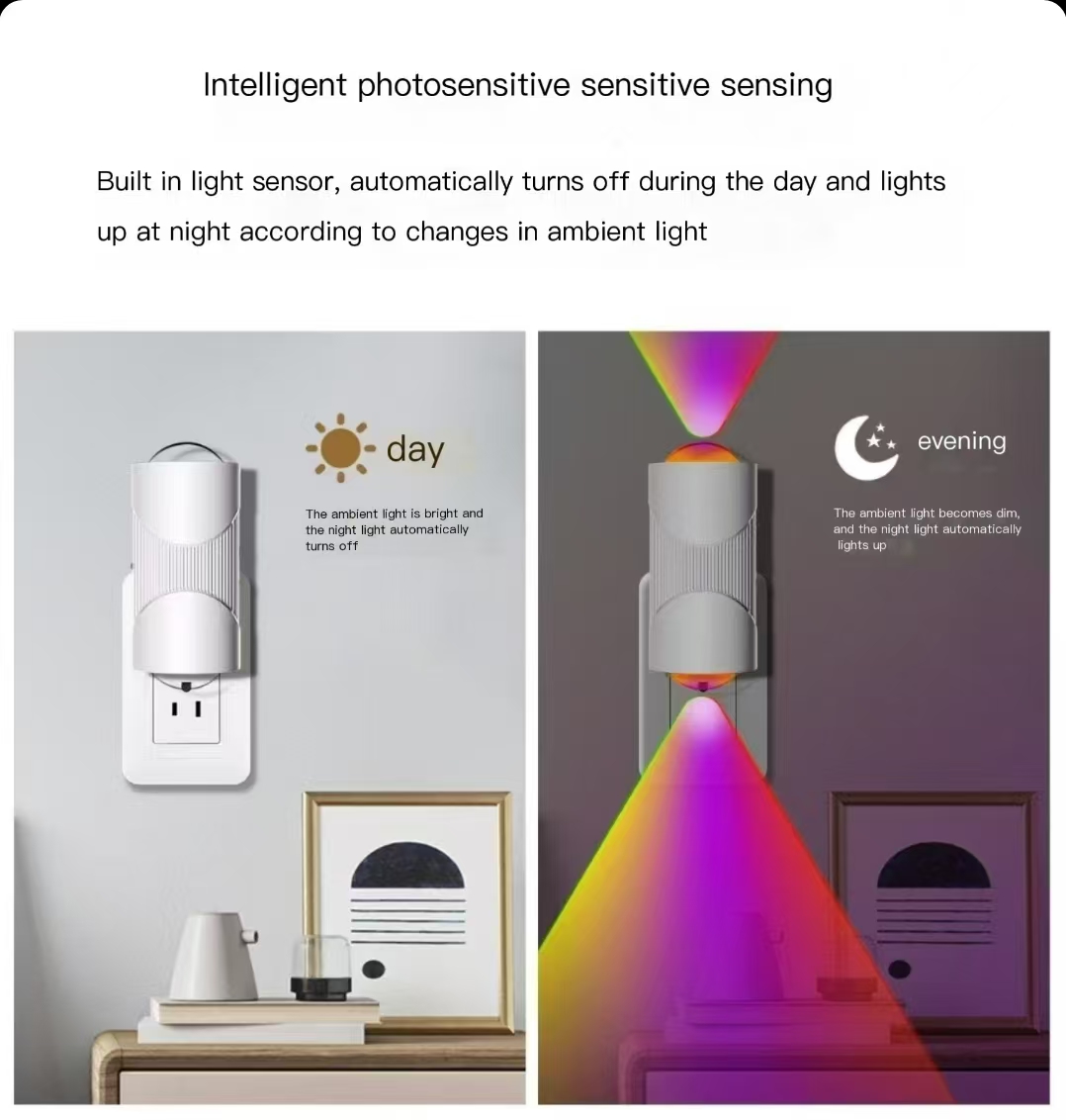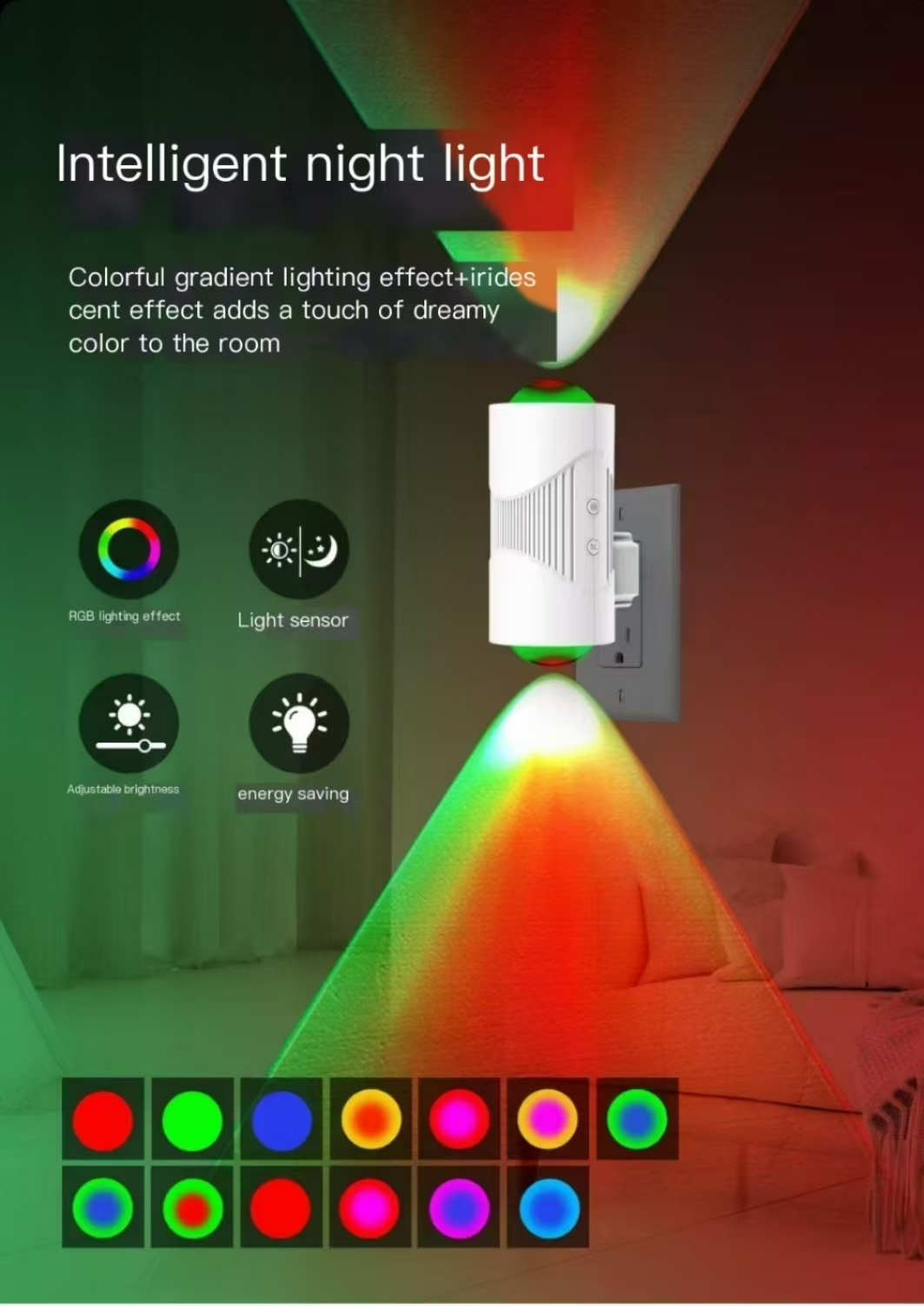 Product Name: Intelligent Night Light Product Model:YSJ-009 Light source: LED Sensor: Optical Sensor Color temperature:3000K/RGBW Power supply mode: plug-in type Product Material: ABS+Acrylic Rated power: 0.5~1W Product size: 49 * 92 * 108mm Brightness adjustment: Four adjustable brightness levels Input voltage:AC100-240V50-60Hz