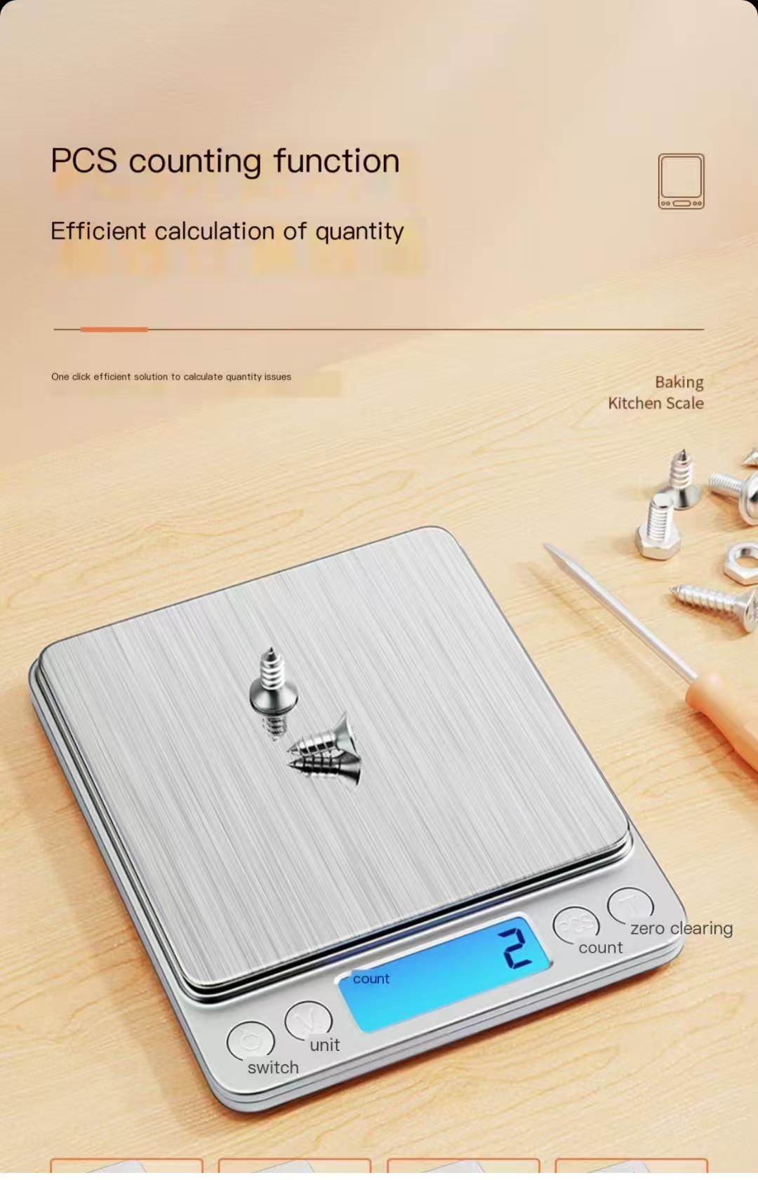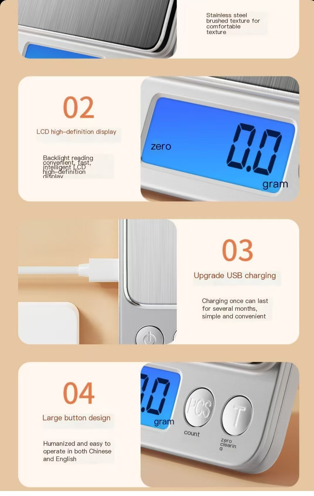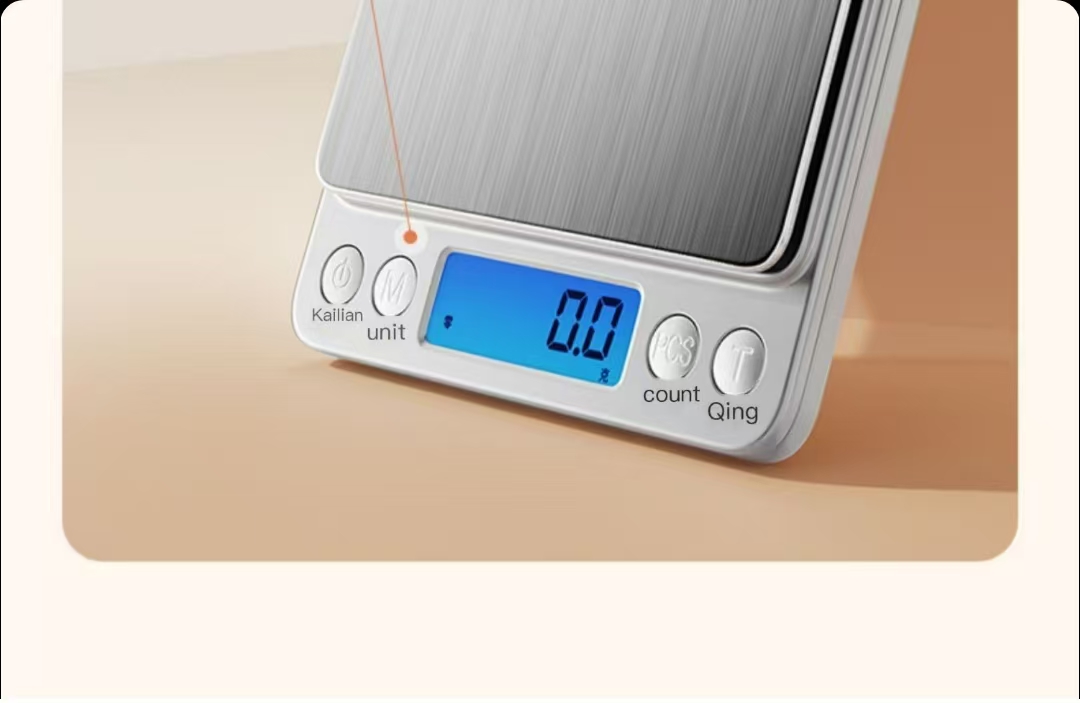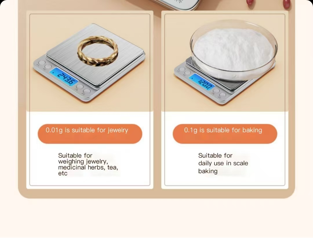 This product allows one-click unit switching, easily handling various measurement requirements. It is made with material that is drop- and impact-resistant and provides accuracy up to 0.01g. The product size is 12.7cm x 10.6cm... it is used for the kitchen, baking, jewelry, herbs, tea, dye paste, and small industrial hardware parts. It is compact and delicate... For higher precision, it is recommended to use models with 200g/0.01g or 500g/0.01g. For even higher accuracy, it is suggested to purchase a set of calibration weights, so the scale can be calibrated at any time. For home baking, you can choose according to your needs: 1kg/2 jin, 2kg/4 jin, or 3kg/6 jin. There are versions in Chinese and English; the English version is entirely in English. If needed, you can consult customer service.