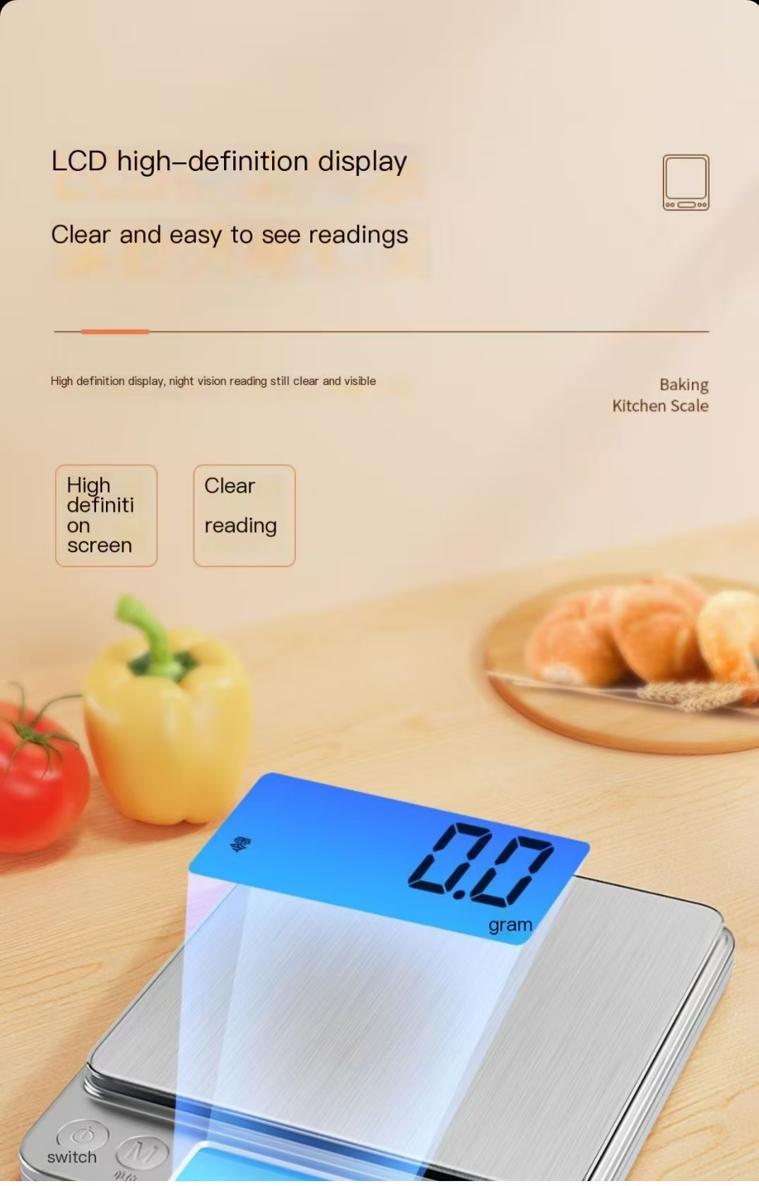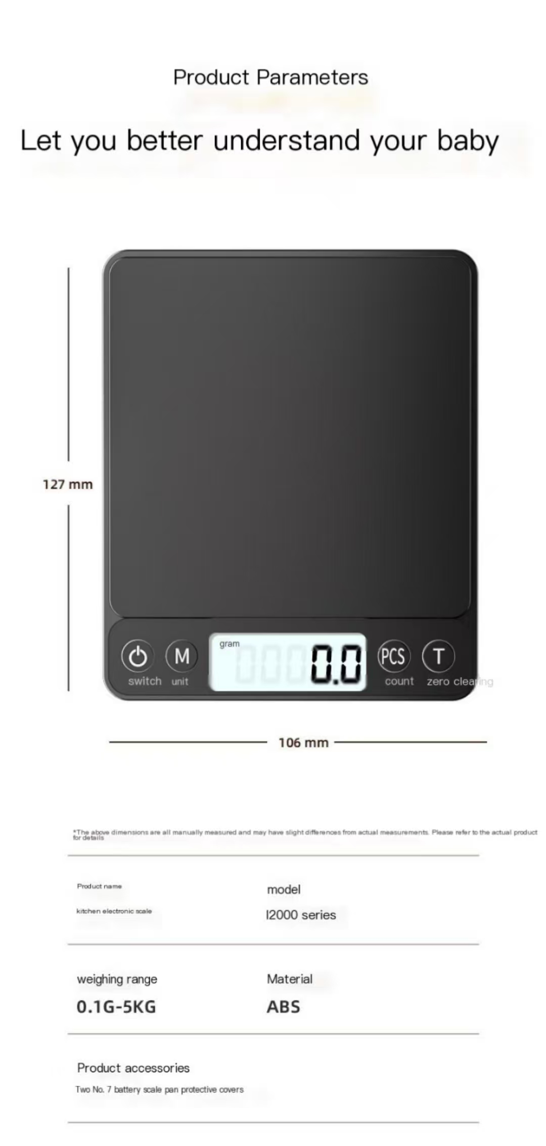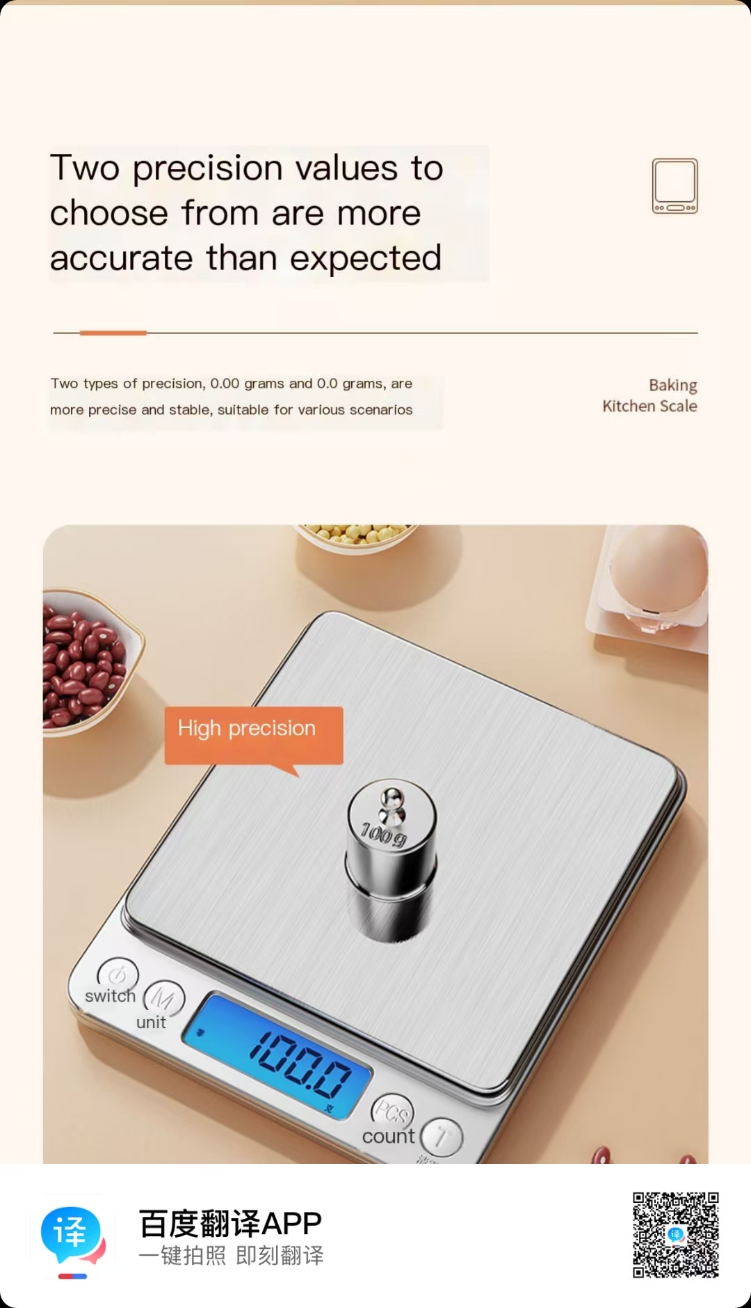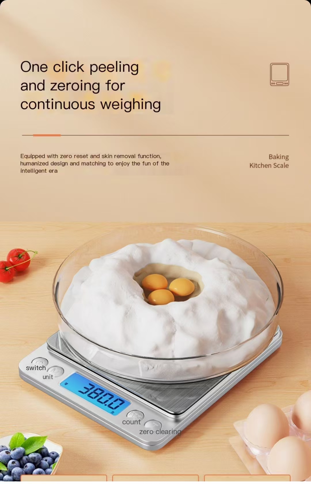 This product allows one-click unit switching, easily handling various measurement requirements. It is made with material that is drop- and impact-resistant and provides accuracy up to 0.01g. The product size is 12.7cm x 10.6cm... it is used for the kitchen, baking, jewelry, herbs, tea, dye paste, and small industrial hardware parts. It is compact and delicate... For higher precision, it is recommended to use models with 200g/0.01g or 500g/0.01g. For even higher accuracy, it is suggested to purchase a set of calibration weights, so the scale can be calibrated at any time. For home baking, you can choose according to your needs: 1kg/2 jin, 2kg/4 jin, or 3kg/6 jin. There are versions in Chinese and English; the English version is entirely in English. If needed, you can consult customer service.