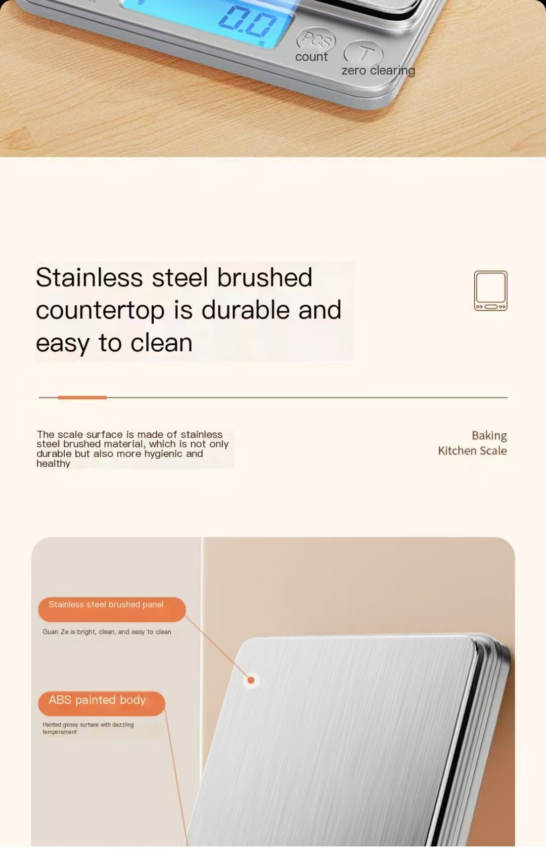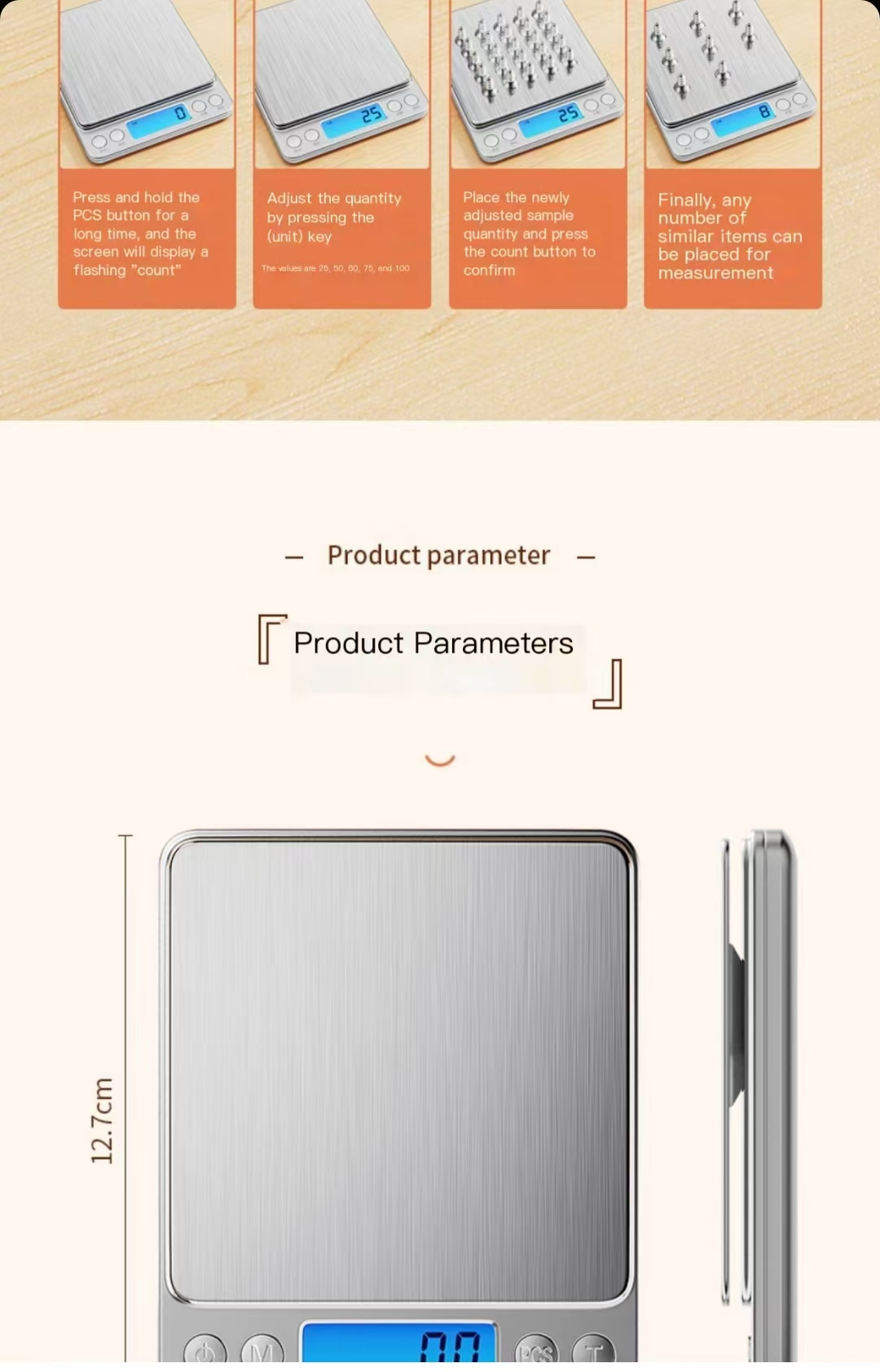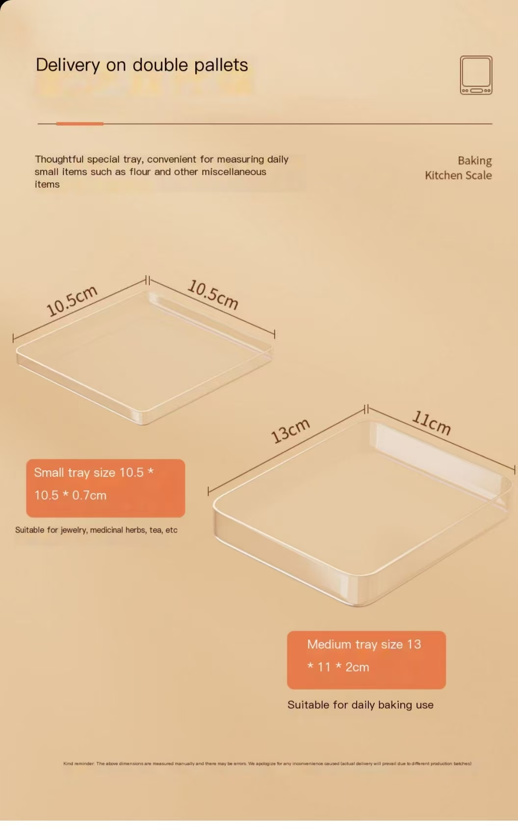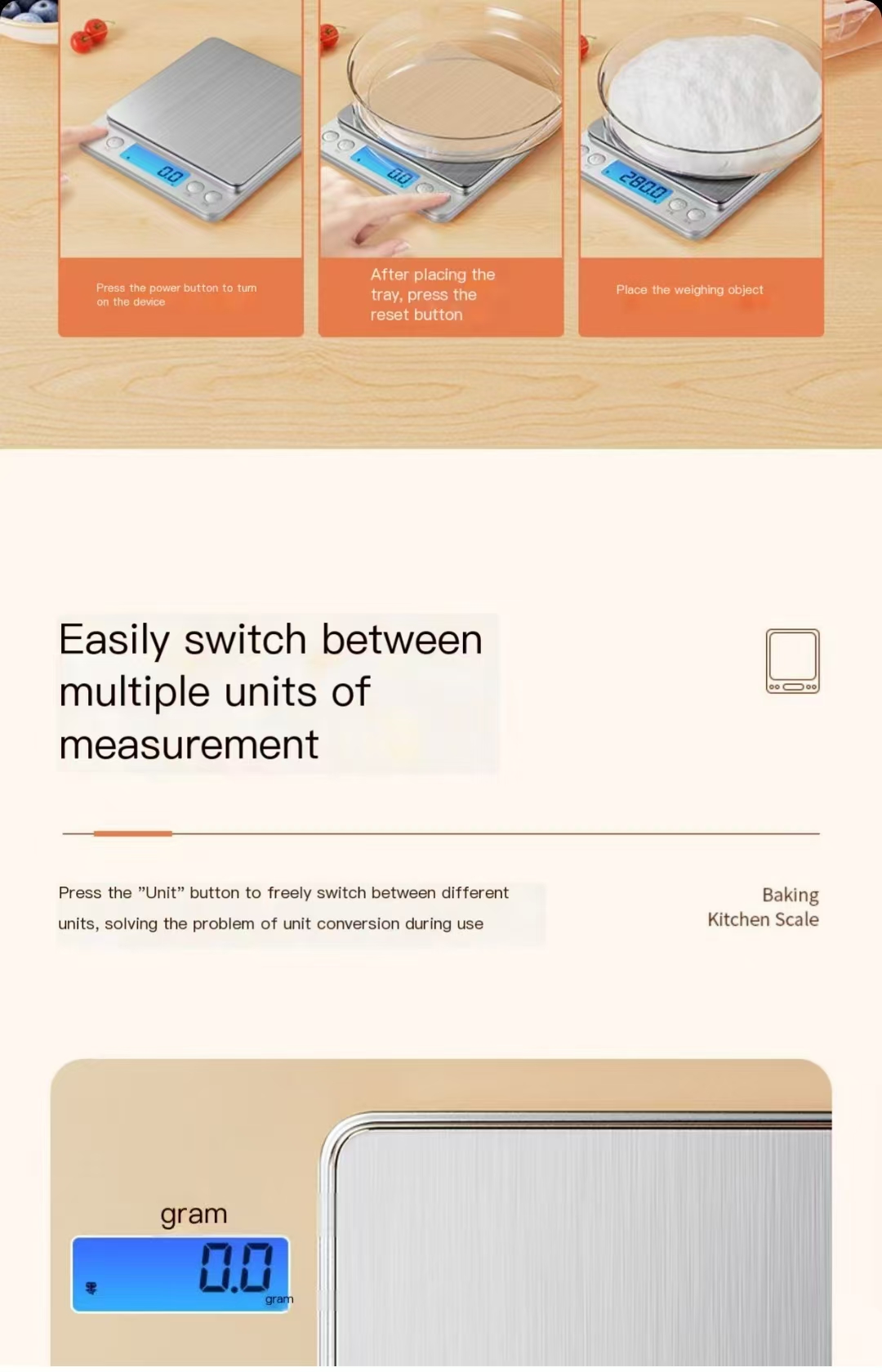 This product allows one-click unit switching, easily handling various measurement requirements. It is made with material that is drop- and impact-resistant and provides accuracy up to 0.01g. The product size is 12.7cm x 10.6cm... it is used for the kitchen, baking, jewelry, herbs, tea, dye paste, and small industrial hardware parts. It is compact and delicate... For higher precision, it is recommended to use models with 200g/0.01g or 500g/0.01g. For even higher accuracy, it is suggested to purchase a set of calibration weights, so the scale can be calibrated at any time. For home baking, you can choose according to your needs: 1kg/2 jin, 2kg/4 jin, or 3kg/6 jin. There are versions in Chinese and English; the English version is entirely in English. If needed, you can consult customer service.